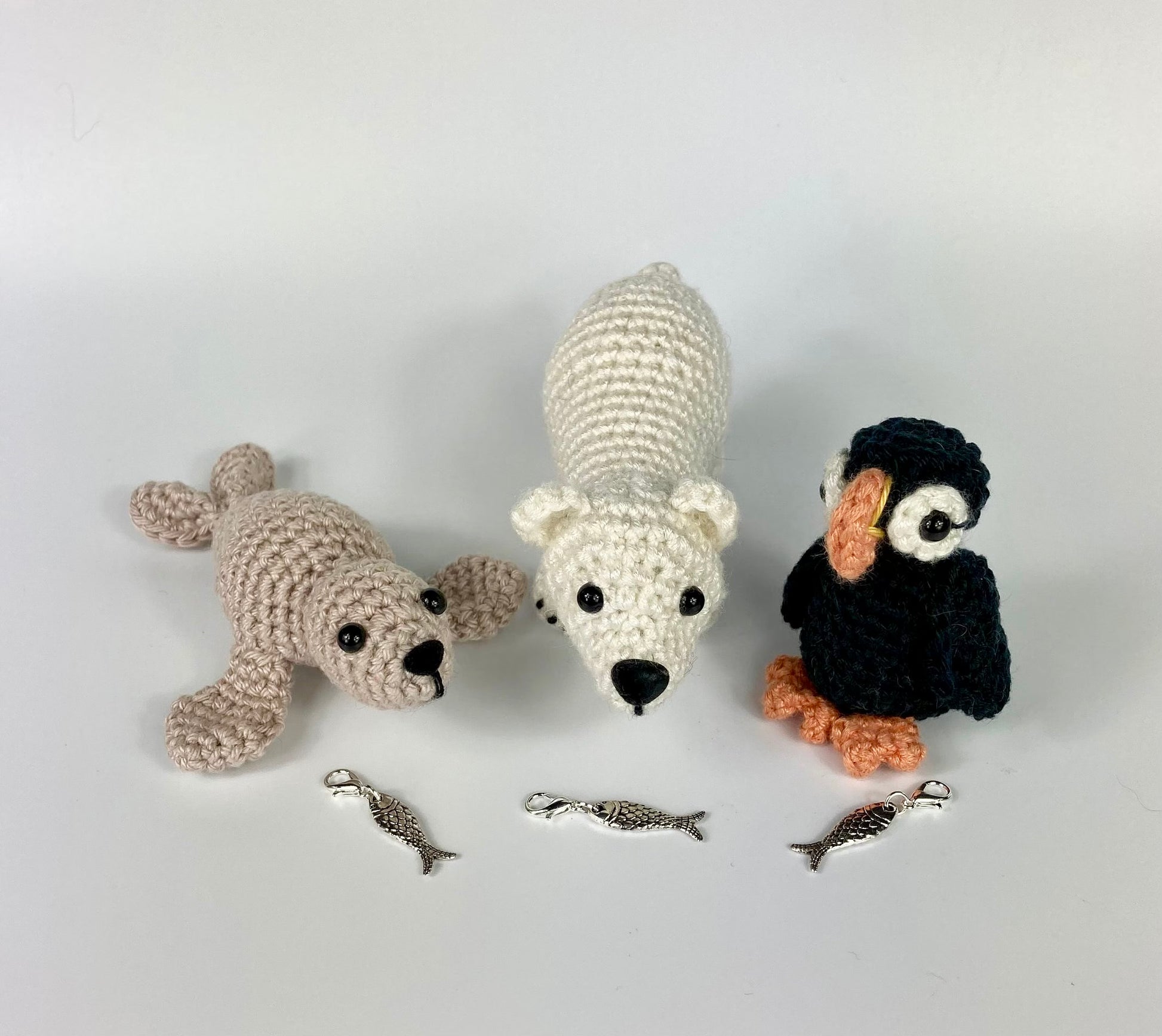 The kit includes a keyring fixing so you have the option to use your Polar Bear Cub as a keyring or a bag charm and a fish stitch-marker with silver plated fixings which doubles as as an additional charm for your keyring. So cute!