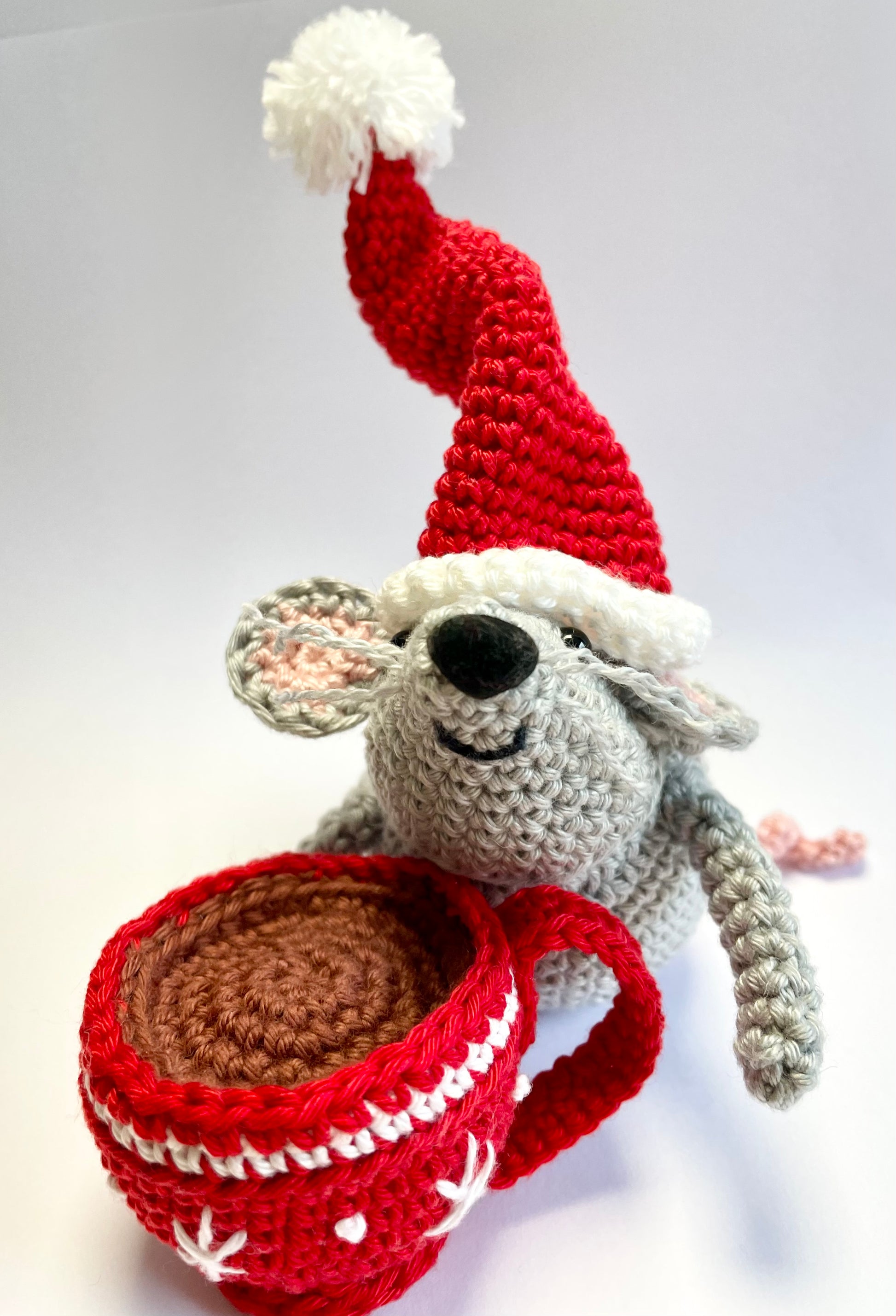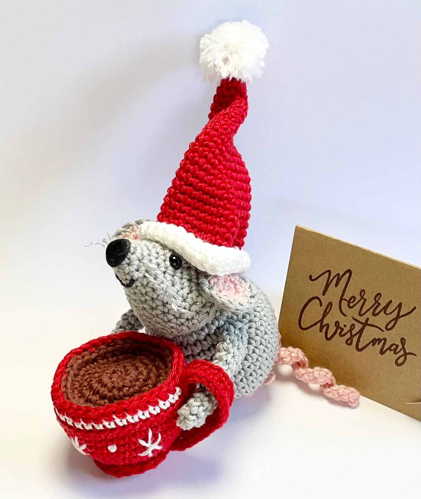Meet Bill! One of the new mice created for Christmas 2025. A little grey mouse in his jolly Santa hat with a yummy cup of hot chocolate!