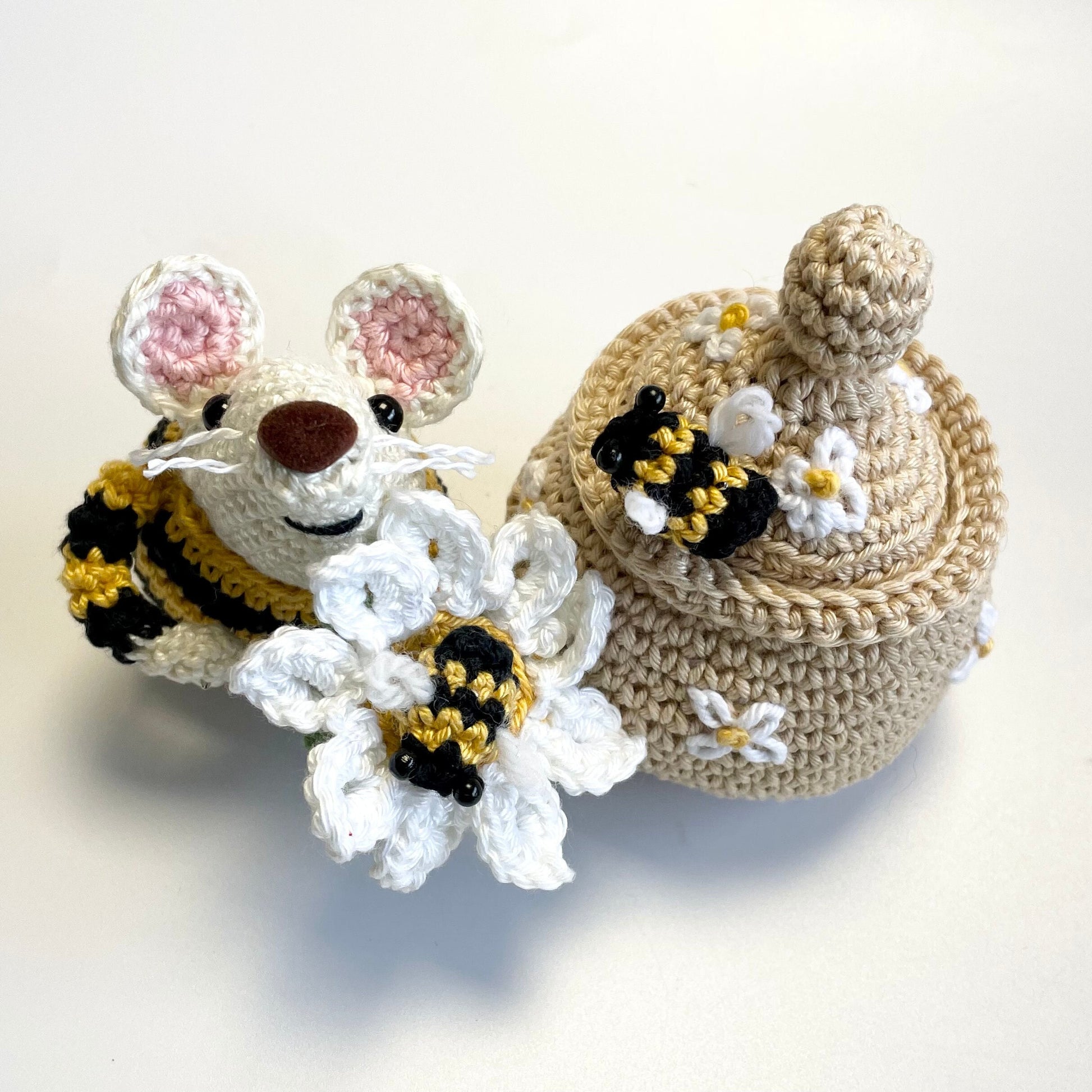 This dear little mouse stands 9.5cm tall when crocheted and has a daisy, bees and a honey pot as part of her kit.