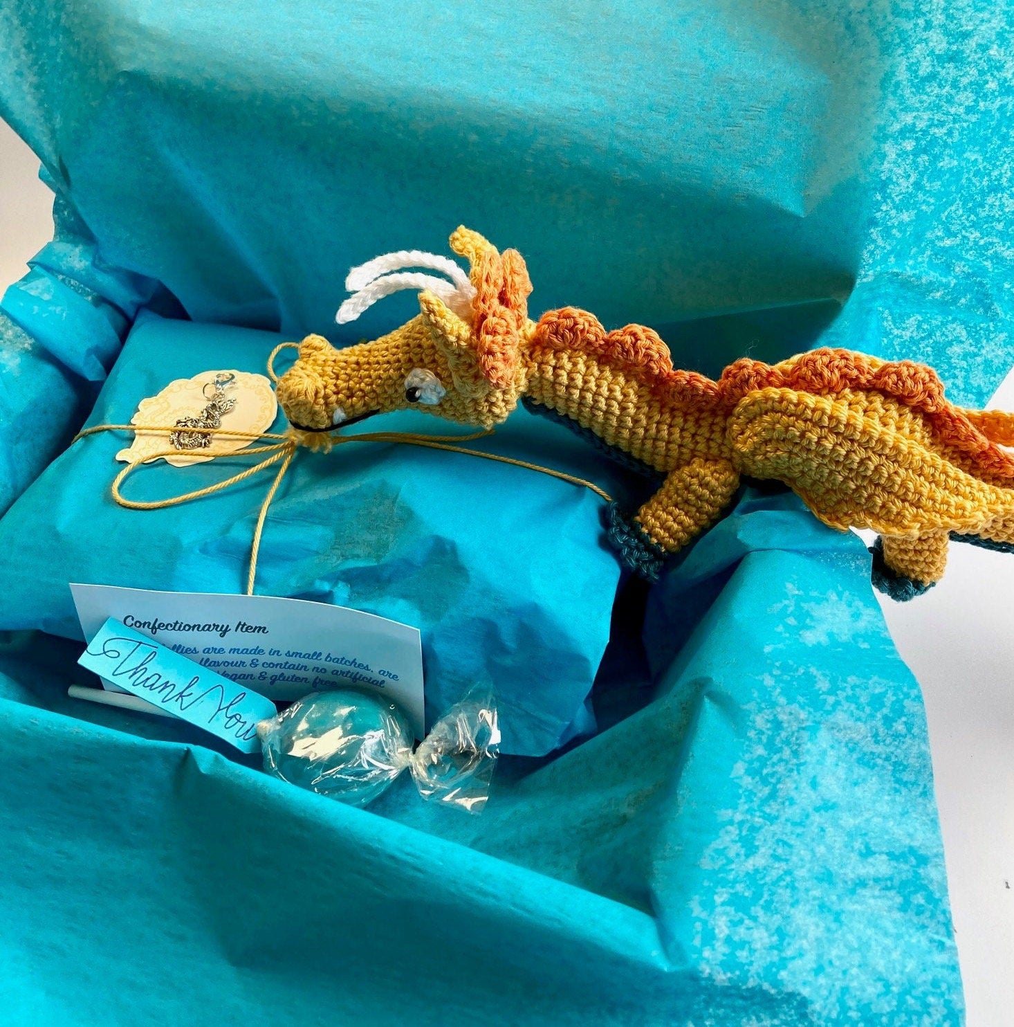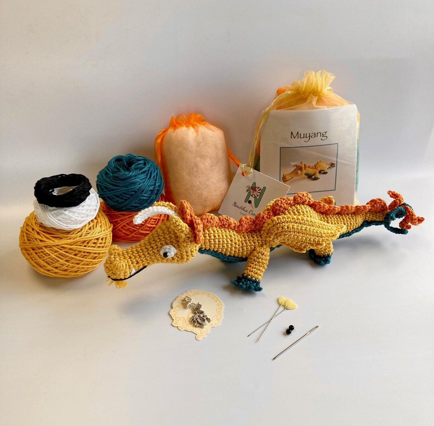 The Kit Comprises: * Full instructions. Step by step with photo aids and special stitch instructions for those who haven't bobble stitched before. (The kit is written in English Crochet with a guide for those who would rather use U.S terms). * Our soft 100% cotton yarns, made for us in the UK. * Our cute Chinese Dragon stitch marker. * 2 x yellow heart, extra long pins. * A Yarn Needle * Bead eyes (if you are crocheting this kit for a child and would prefer safety eyes please message me and I will pop some in - no extra charge) * A bag of stuffing All in an organza drawstring bag.