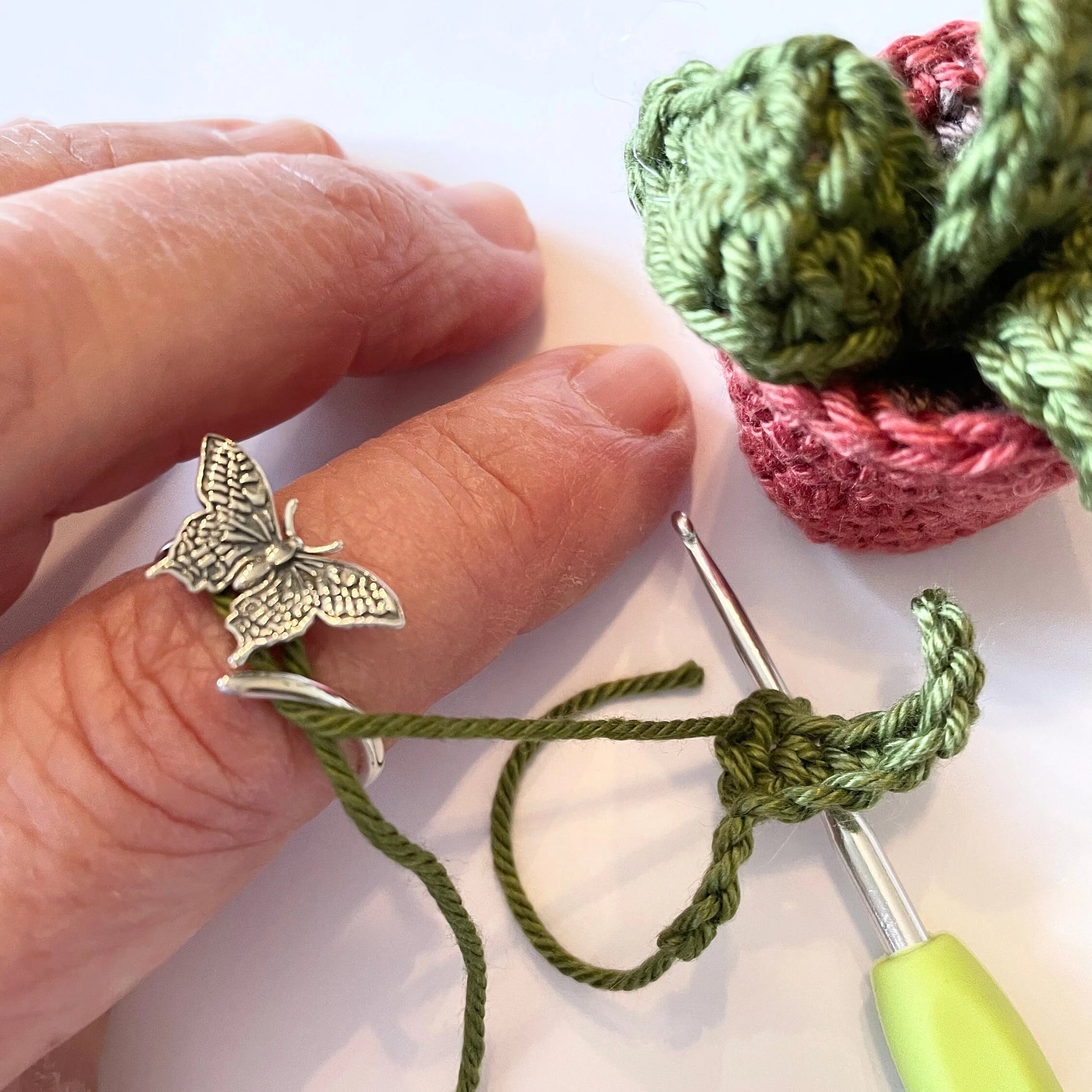 It keeps the tension in the yarn resulting in a smooth crochet without having to keep adjusting your yarn hand. Whatever your crochet style, however you hold your yarn, this ring works from fine yarns/threads to Arans.