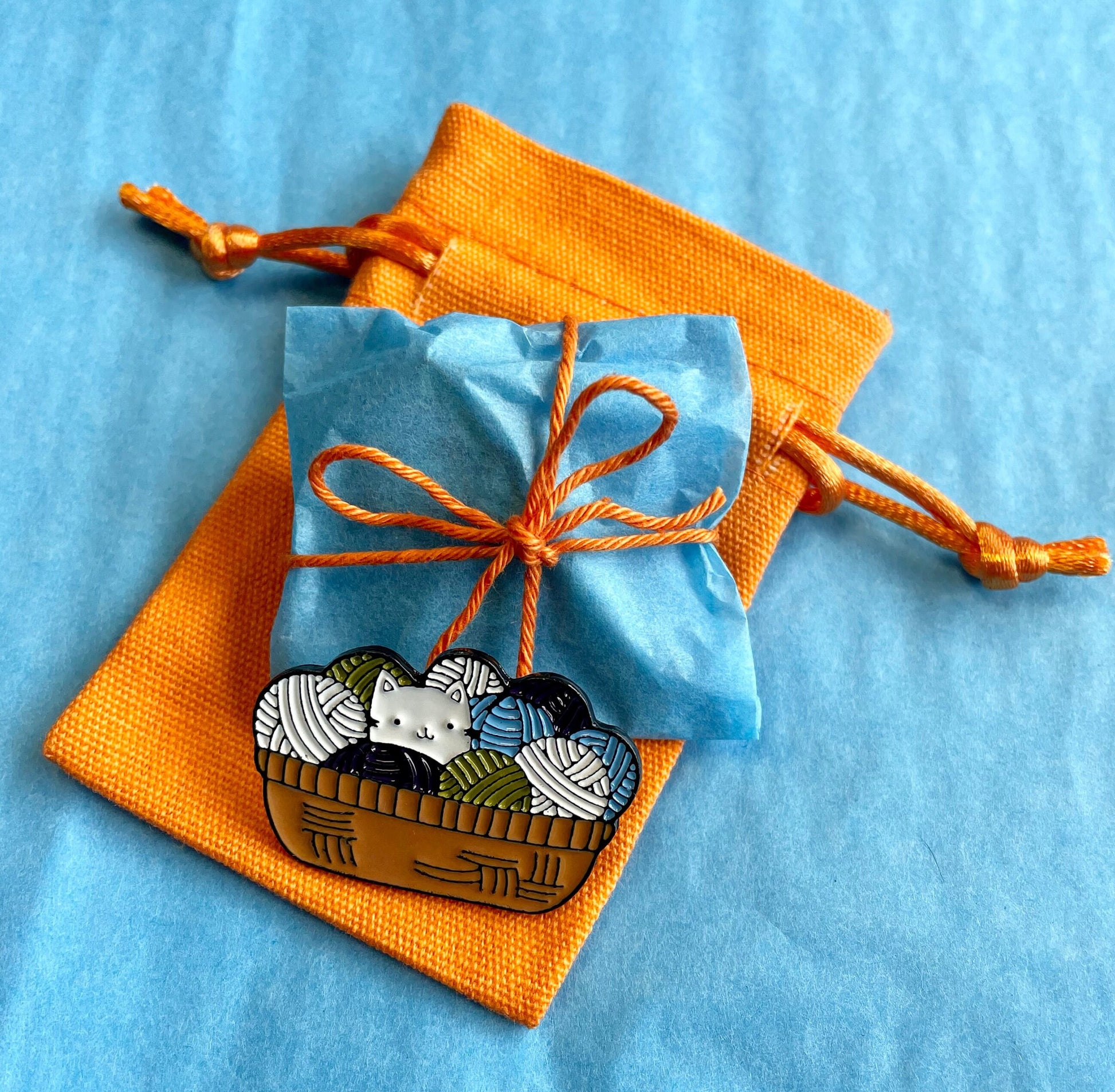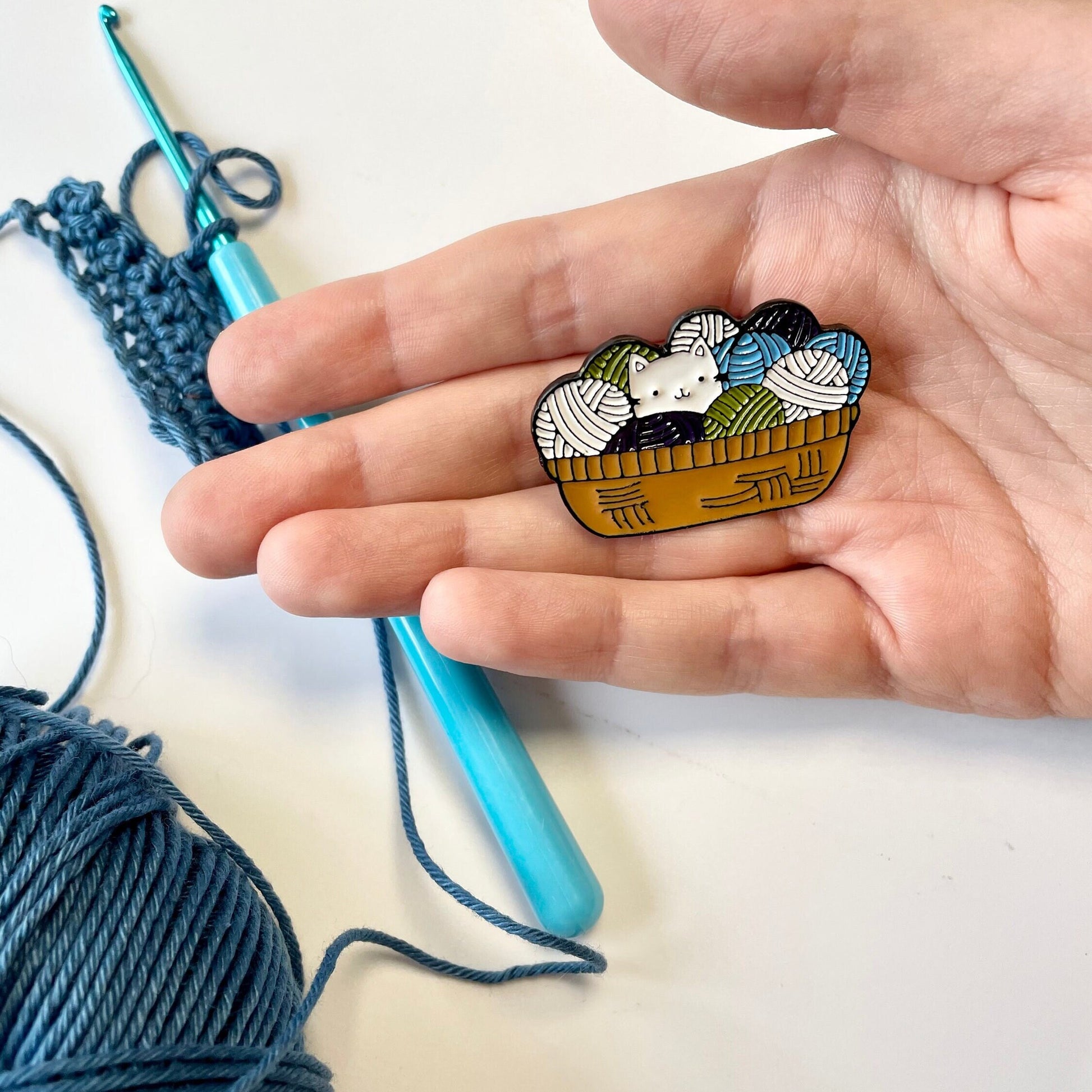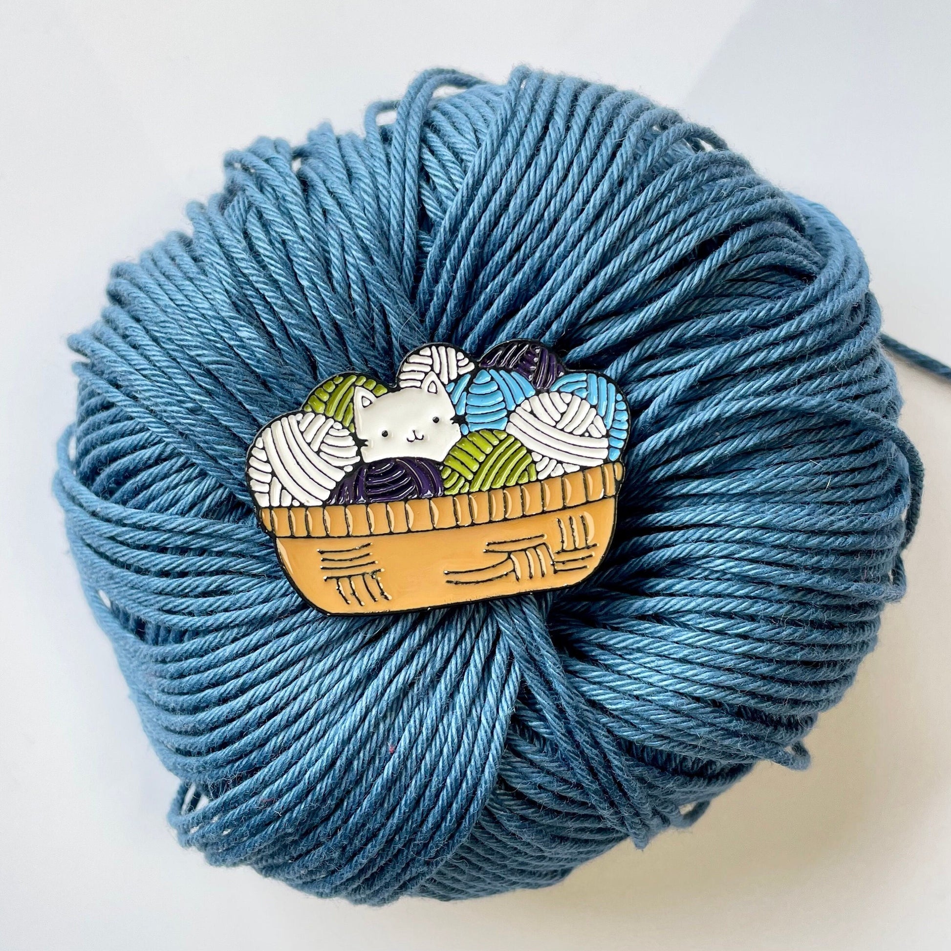 Awww! What a little cutie! An enamel pin badge featuring an adorable white kitty peaking out of a basket of yarn, perfect for a crocheter, knitter and/or cheeky cat lover!
