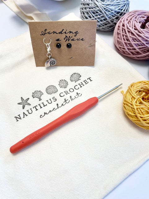 A Silver Nautilus Crochet Stitch Marker - Mounted on our 'Sending a Wave' card.