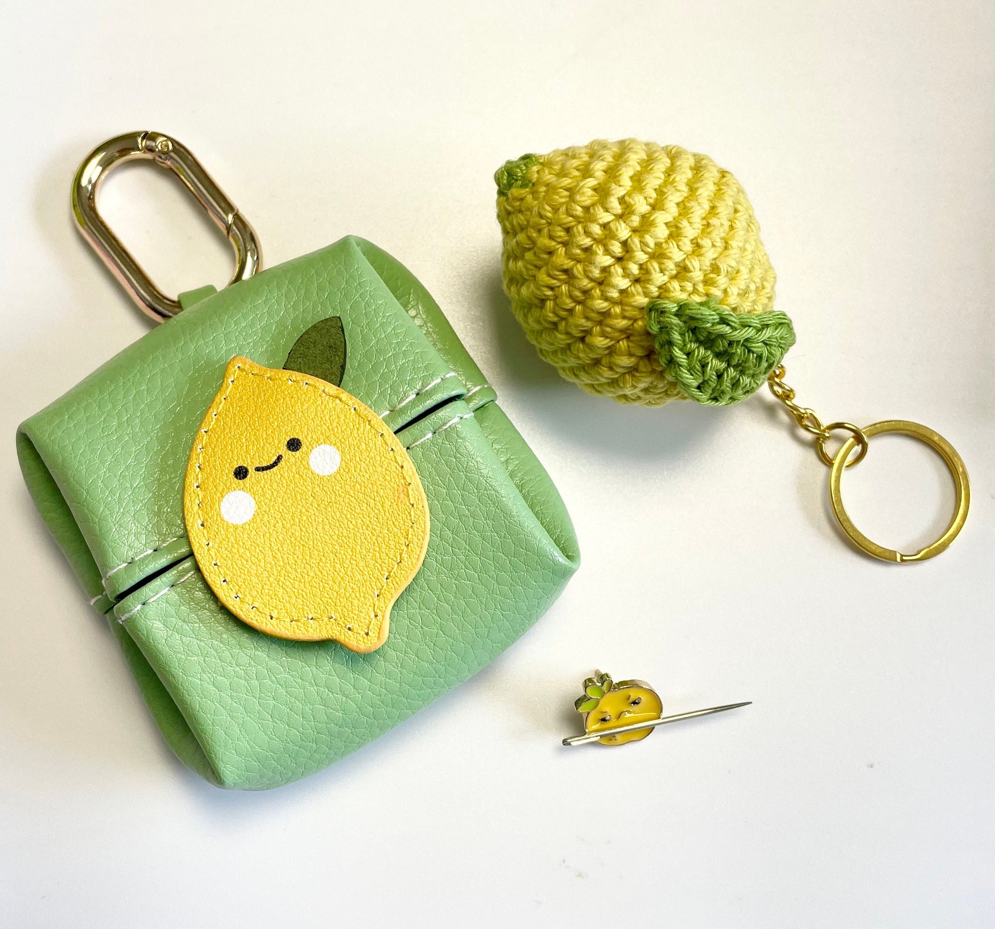 The Kit contains everything you need to make your own lemon keyring, a lemon magnetic enamel pin badge for keeping your needle safe and a cute lemon vegan leather case.