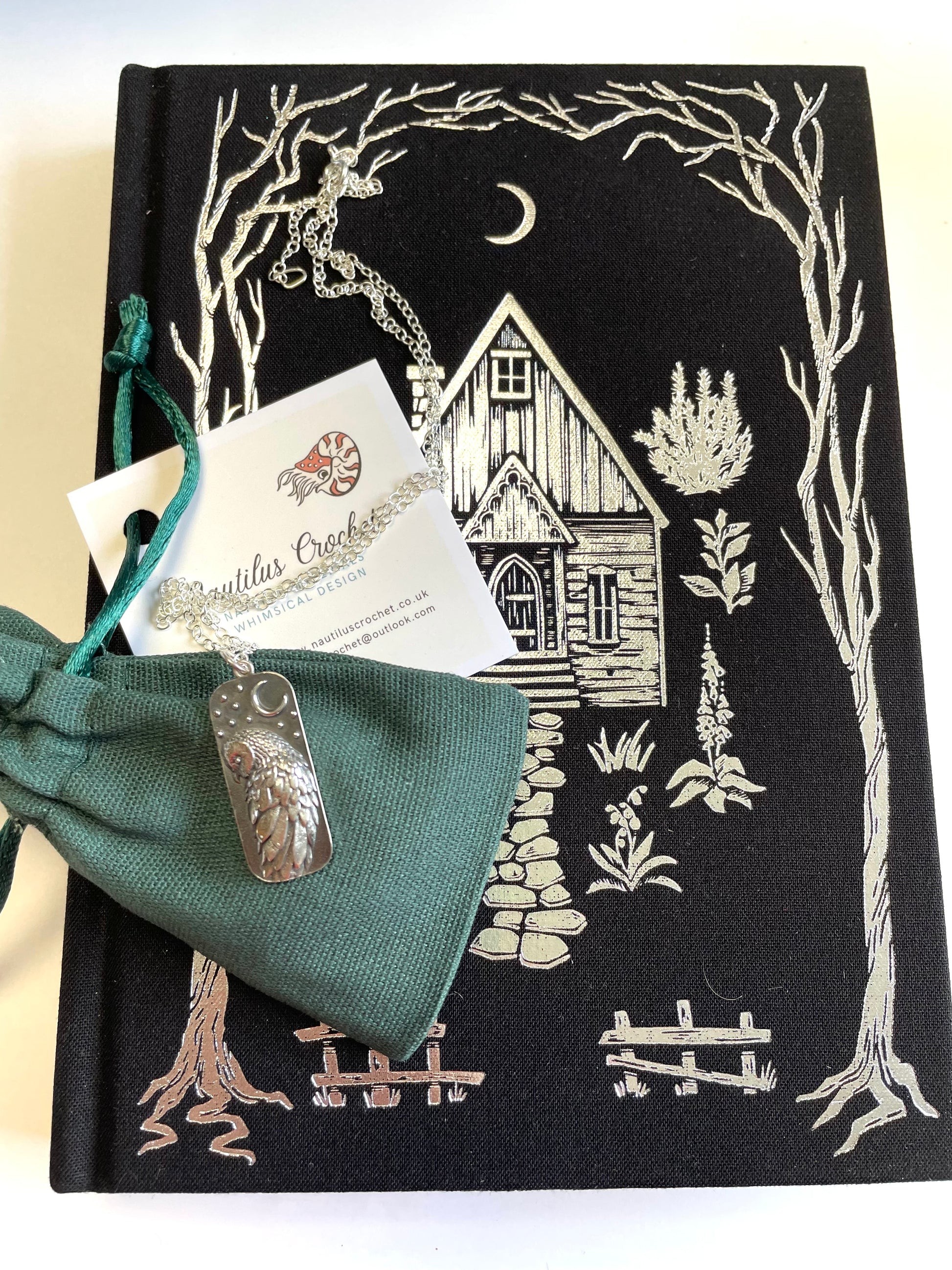 This stunning tag design necklace features a beautifully detailed barn owl, moon and stars. Handmade in recycled Sterling Silver . Gender neutral.