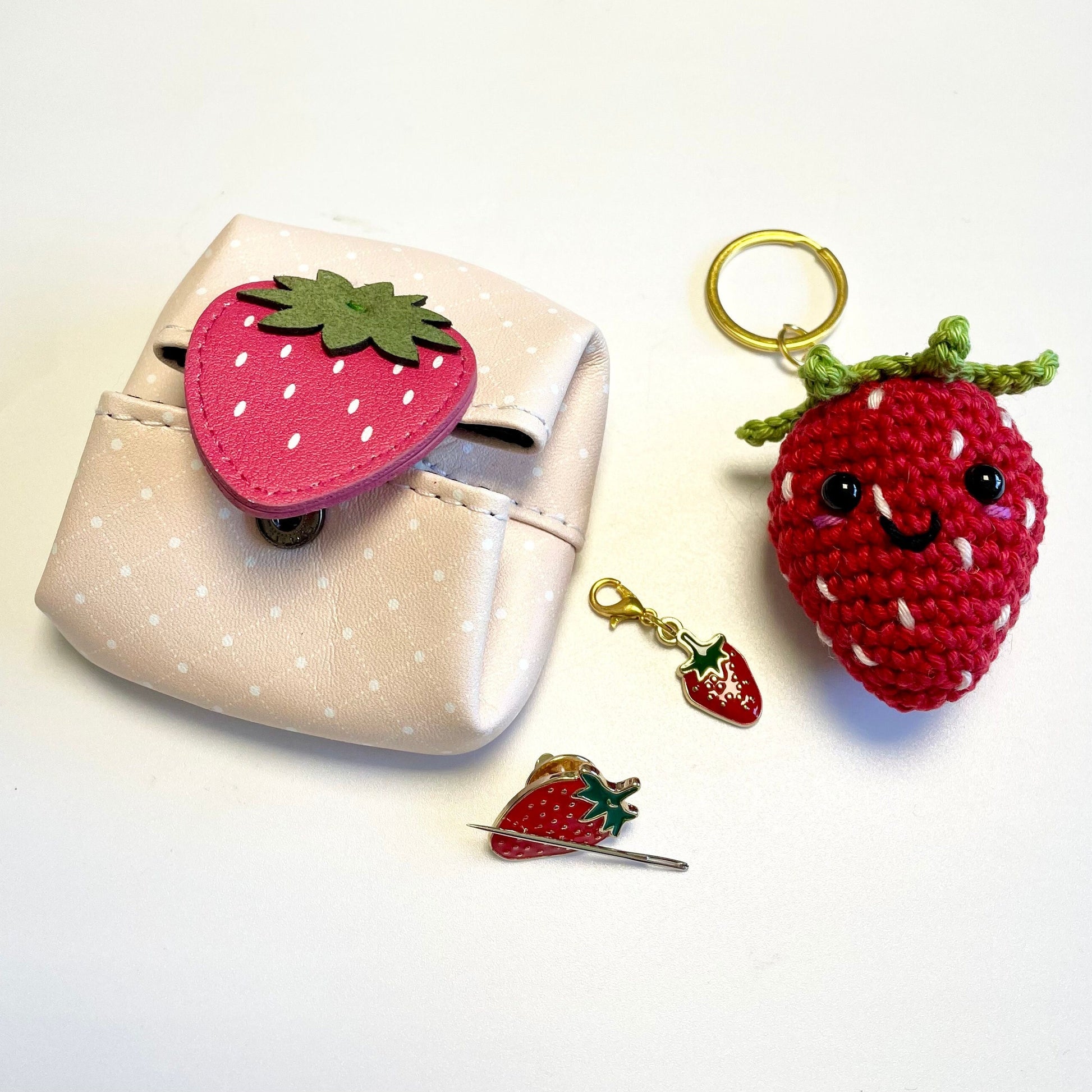 The Kit contains everything you need to make your own strawberry keyring, a gorgeous little enamel strawberry stitch marker charm, a strawberry magnetic enamel pin badge for keeping your needle safe and a cute strawberry vegan leather case.