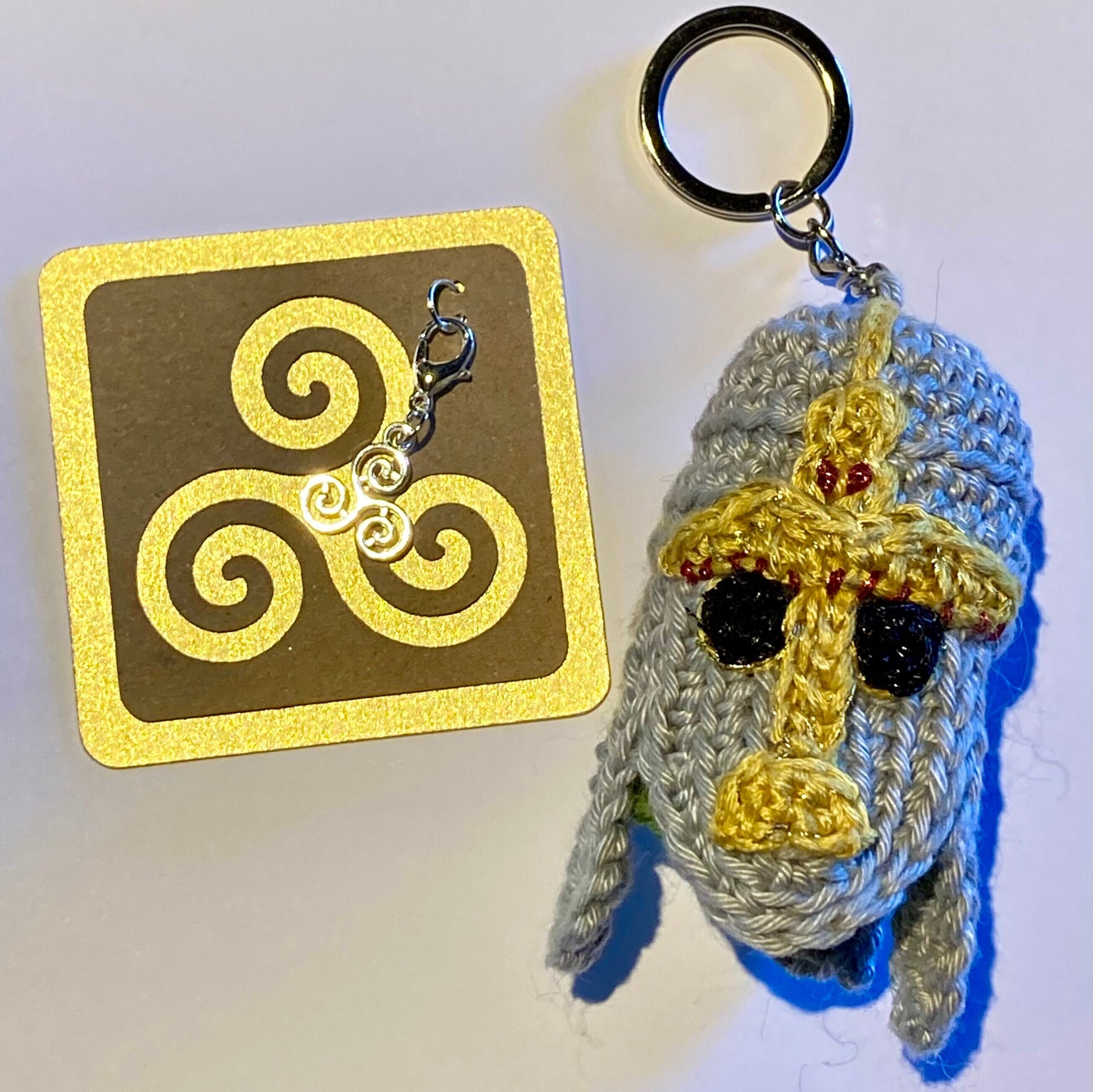 Our Silver Plated Anglo Saxon Treskelion Stitch Marker Charm mounted on our recycled kraft card